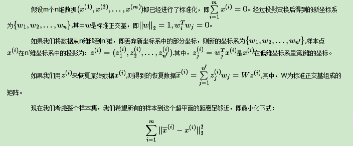 假如我们把n'从1维推广到任意维,则我们的希望降维的标准为:样本点到这个超平面的距离足够近,或者说样本点在这个超平面上的投影能尽可能的分开。