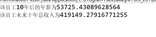 package myWork; public class xxx6 { public static void main(String[] args) { // TODO Auto-generated method stub double i = 30000; double sum = 0; for (int year = 1; year <= 10; year++) { i = i * 1.06; sum += i; } System.out.println("该员工10年后的年薪为" + i); System.out.println("该员工未来十年总收入为" + sum); }