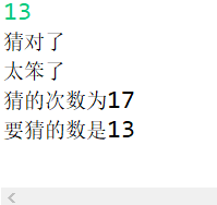 Import java.util.Scanner; import java.util.Random; public class xxx9 { public static void main(String[] args) { Random r = new Random(); int x = r.nextInt(100); Scanner input = new Scanner(System.in); int n = input.nextInt(); int ci=1; while (n != x) { if (n > x) { System.out.println("大一点"); } else if (n < x) { System.out.println("小一点"); } n = input.nextInt(); if (n == x) { System.out.println("猜对了"); } ci++; } if(ci>0&&ci<=3){ System.out.println("太棒了"); }else if(ci>=4&&ci<=8){ System.out.println("一般般"); }if(ci>8){ System.out.println("太笨了"); } System.out.println("猜的次数为"+ci); System.out.println("要猜的数是"+x); } }
