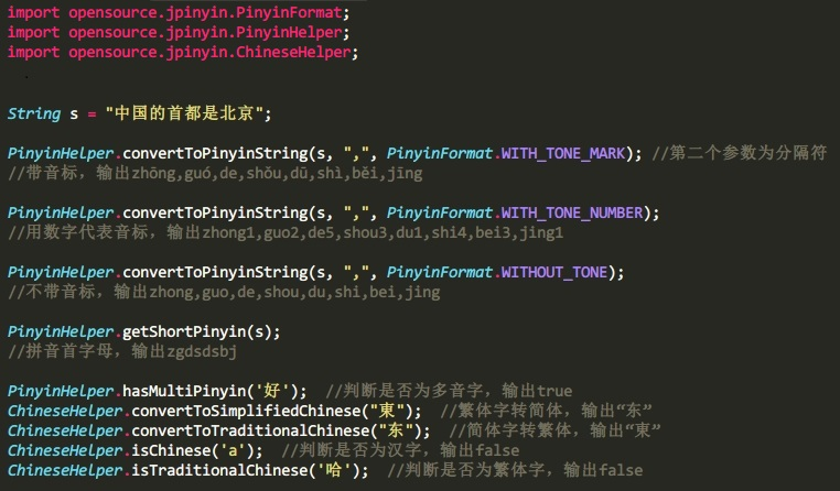 JPinyin支持多种拼音输出格式:带音标、不带音标、数字表示音标以及拼音首字母输出格式;