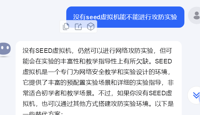 问题2解决方案:同样在看视频学习的过程中,一直是将SEED与WinXP和kali一起安装的,直到后面我才意识到,SEED不完全是攻击机,它相当于是一个可攻可守的平台,是一个安全、可控的环境中练习各种攻击和防御技巧,而不用担心会破坏真实的系统或者造成实际的损失。我害怕是我理解有误,我再三确认,seed虚拟机并不是单独一方靶机或者攻击机,有了深入的了解。