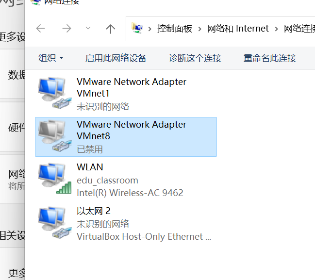 问题4解决方案:vmnet1是为仅主机模式服务的虚拟网络适配器,它创建了一个隔离的虚拟网络环境,仅允许主机与虚拟机之间、以及虚拟机之间的通信,但虚拟机无法访问外部网络;vmnet8是为NAT模式服务的虚拟网络适配器,它允许虚拟机通过主机访问外部网络,但外部网络无法直接访问虚拟机。