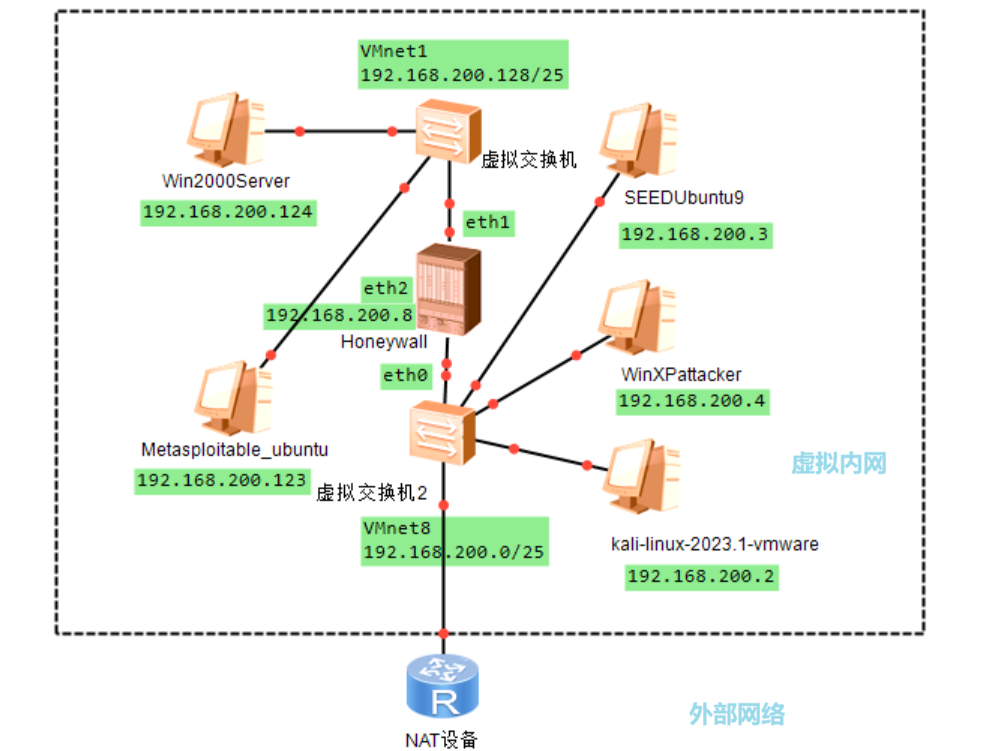 WinXPattacker 192.168.200.4 | Win2000Server_SP0_target 192.168.200.124 | SEEDUbuntu9 192.168.200.3 | Honeywall 192.168.200.8 |