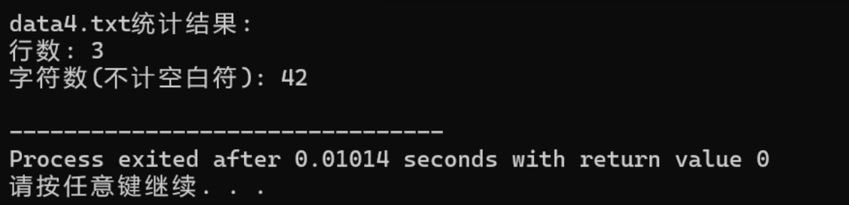 #define _CRT_SECURE_NO_WARNINGS #include <stdio.h> #include <stdlib.h> int main() { FILE *fp; char fname[] = "D:\\cccode.data4.txt"; char ch; int lines = 0; int characters = 0; fp = fopen(fname, "r"); if (fp == NULL) { perror("fail to open the file to read\n"); return 0; } while (!feof(fp)) { ch = fgetc(fp); if (ch != ' ' && ch!= '\n' && ch != '\t') { characters++; } if (ch == '\n') { lines++; } } --characters; fclose(fp); printf("data4.txt统计结果:\n"); printf("行数: %d\n", lines + 1); printf("字符数(不计空白符): %d\n", characters); system("pause"); return 0; }