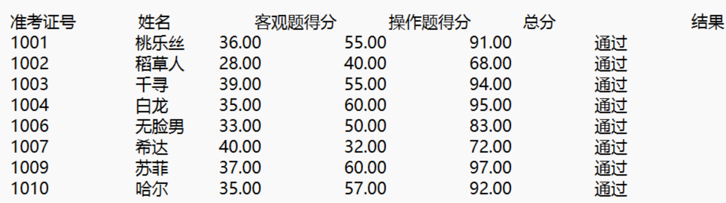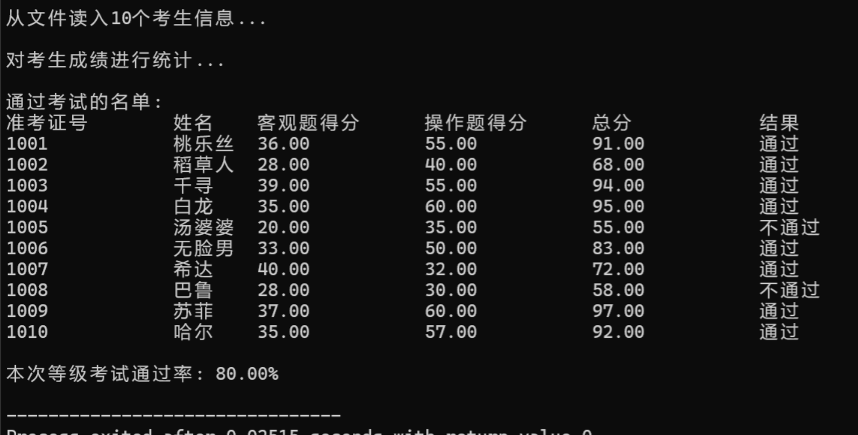 #define _CRT_SECURE_NO_WARNINGS #include <stdio.h> #include <string.h> #define N 10 typedef struct { long id; // 准考证号 char name[20]; // 姓名 float objective; // 客观题得分 float subjective; // 操作题得分 float sum; // 总分 char result[10]; // 考试结果 } STU; // 函数声明 void read(STU st[], int n); void write(STU st[], int n); void output(STU st[], int n); int process(STU st[], int n, STU st_pass[]); int main() { STU stu[N], stu_pass[N]; int cnt; double pass_rate; printf("从文件读入%d个考生信息...\n", N); read(stu, N); printf("\n对考生成绩进行统计...\n"); cnt = process(stu, N, stu_pass); printf("\n通过考试的名单:\n"); output(stu, N); // 输出所有考生完整信息到屏幕 write(stu, N); // 输出考试通过的考生信息到文件 pass_rate = 1.0 * cnt / N; printf("\n本次等级考试通过率: %.2f%%\n", pass_rate*100); return 0; } // 把所有考生完整信息输出到屏幕上 // 准考证号,姓名,客观题得分,操作题得分,总分,结果 void output(STU st[], int n) { int i; printf("准考证号\t姓名\t客观题得分\t操作题得分\t总分\t\t结果\n"); for(i = 0; i < n; i++) printf("%ld\t\t%s\t%.2f\t\t%.2f\t\t%.2f\t\t%s\n", st[i].id, st[i].name, st[i].objective, st[i].subjective, st[i].sum, st[i].result); } // 从文本文件examinee.txt读入考生信息:准考证号,姓名,客观题得分,操作题得分 void read(STU st[], int n) { int i; FILE *fin; fin = fopen("d:\\cccode.examinee.txt", "r"); if (!fin) { printf("fail to open file\n"); return; } while (feof(fin) == NULL) { for(i = 0; i < n; i++) fscanf(fin, "%ld %s %f %f", &st[i].id, st[i].name, &st[i].objective, &st[i].subjective); } fclose(fin); } // 把通过考试的考生完整信息写入文件list_pass.txt // 准考证号,姓名,客观题得分,操作题得分,总分,结果 void write(STU s[], int n) { int i; FILE *fp; fp=fopen("D:\\cccode.list_pass.txt","w"); if(!fp){ printf("fail to open file\n"); return; } fprintf(fp,"%-20s%-20s%-20s%-20s%-30s%-30s\n","准考证号","姓名","客观题得分","操作题得分","总分","结果"); for(i=0;i<n;++i){ if(s[i].sum>=60) fprintf(fp,"%-20ld\t%-10s\t%-20.2f\t%-20.2f\t%-20.2f\t%-20s\n",s[i].id,s[i].name,s[i].objective,s[i].subjective,s[i].sum,s[i].result); } fclose(fp); } // 对考生信息进行处理:计算每位考生考试总分、结果;统计考试通过的人数 int process(STU st[], int n, STU st_pass[]) { int i,j=0; for(i=0;i<n;++i) st[i].sum=st[i].objective+st[i].subjective; for(i=0;i<n;++i) if(st[i].sum>=60){ strcpy(st[i].result,"通过"); st_pass[j]=st[i]; j+=1; } else strcpy(st[i].result,"未通过"); return j; }