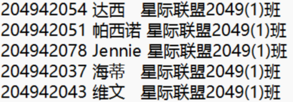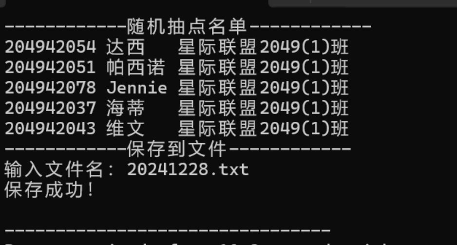 #include<stdio.h> #include<stdlib.h> #include<time.h> #include<string.h> typedef struct{ long id; char name[20]; char class[20]; }STU; void read(STU st[]){ FILE *fp; fp = fopen("d:\\cccode.list.txt", "r"); if(fp == NULL){ printf("fail to open the file\n"); return; } int i, number; while(!feof(fp)){ for(i = 0; i < 80; i++){ number = fscanf(fp, "%ld %s %s", &st[i].id, st[i].name, st[i].class); if(number != 3) break; } } fclose(fp); } int main(){ int i,temp,count = 0; int choice[5]; char s[50]; STU st[80]; read(st); srand(time(NULL)); while(count < 5) { int sign = 1; temp = rand() % 80; for(i = 0;i<count;i++) { if(count == choice[i]) { sign=0; break; } } if(sign != 0) { choice[i]=temp; count++; } } printf("------------随机抽点名单------------\n"); for (i = 0; i < 5; i++) { printf("%ld %-6s %s\n", st[choice[i]].id, st[choice[i]].name, st[choice[i]].class); } printf("------------保存到文件------------\n输入文件名:"); scanf("%s", s); char list[100]; strcat(list, "D:\\"); strcat(list, s); FILE *fp = fopen(list, "w"); if (fp == NULL) { printf("fail to open file \n"); return; } for (i = 0; i < 5; i++) { fprintf(fp, "%ld %-6s %s\n", st[choice[i]].id, st[choice[i]].name, st[choice[i]].class); } fclose(fp); printf("保存成功!\n"); return 0; }