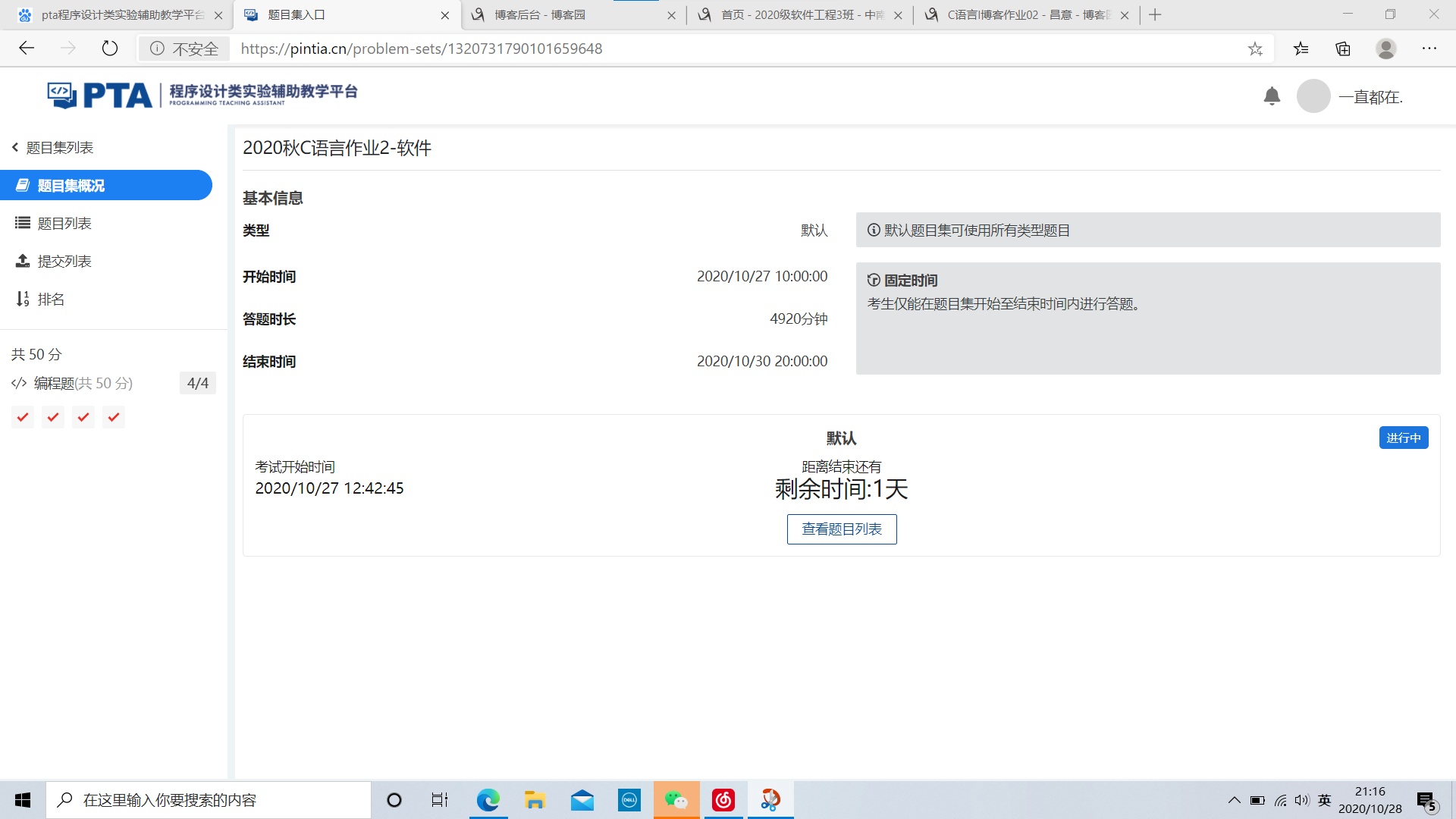 2.2 请完成PTA作业:2020秋C语言作业2。在博客作业中贴出完成图片。(2分)