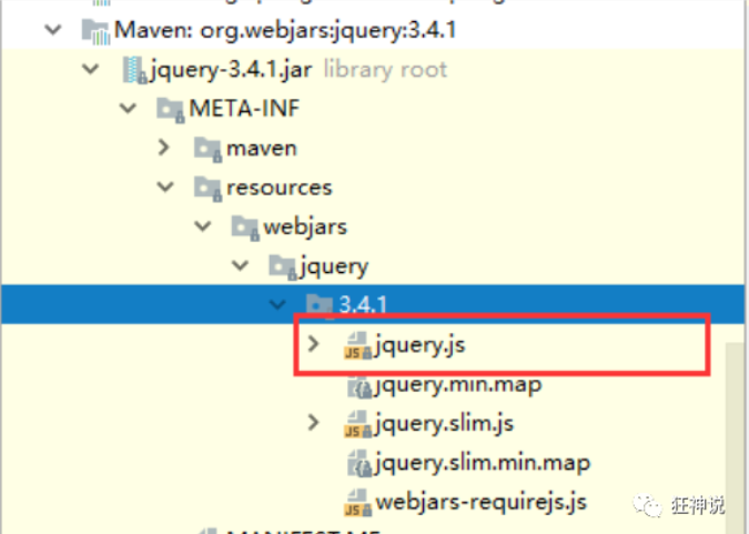 如:http://localhost:8080/webjars/jquery/3.4.1/jquery.js 映射到 jquery-3.4.1.jar/META-INF/resources/webjars/jquery/3.4.1/jquery.js