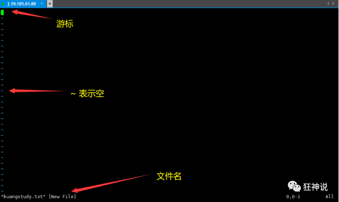 如果你想要使用 vi 来建立一个名为 kuangstudy.txt 的文件时,你可以这样做: