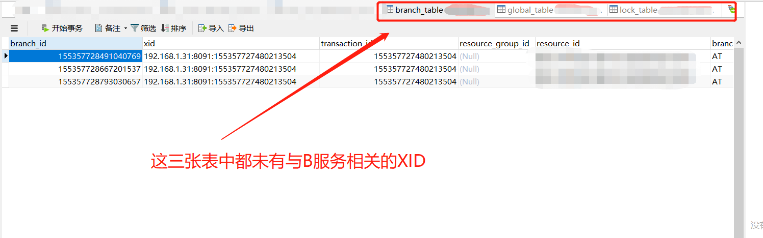 可以看到A,B两个服务的xid并不一致,同时在数据库中也并没有找到B服务的xid,如下图: