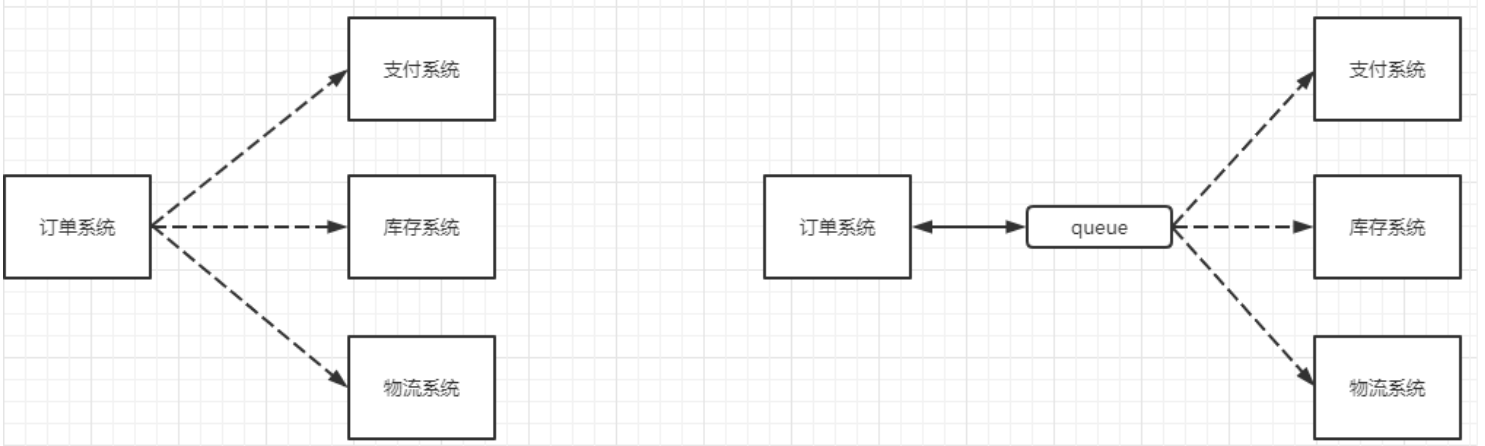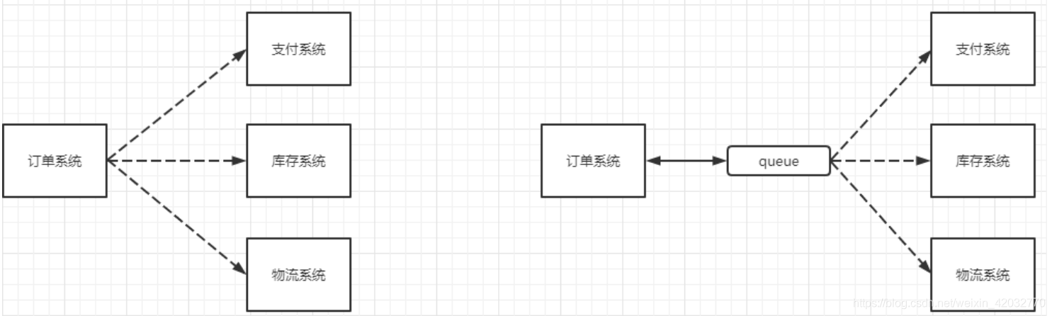 以电商应用为例,应用中有订单系统、库存系统、物流系统、支付系统。用户创建订单后,如果耦合调用库存系统、物流系统、支付系统,任何一个子系统出了故障,都会造成下单操作异常。当转变成基于消息队列的方式后,系统间调用的问题会减少很多,比如物流系统因为发生故障,需要几分钟来修复。在这几分钟的时间里,物流系统要处理的内存被缓存在消息队列中,用户的下单操作可以正常完成。当物流系统恢复后,继续处理订单信息即可,中单用户感受不到物流系统的故障,提升系统的可用性。