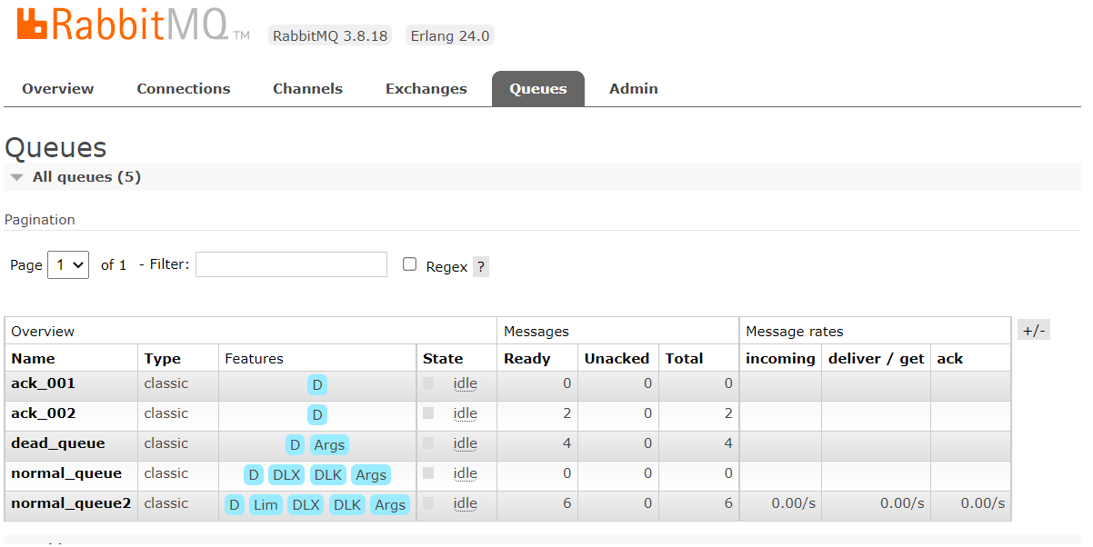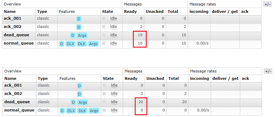 可以发现ttl为30s的消息并没有堵塞ttl为10s的消息。