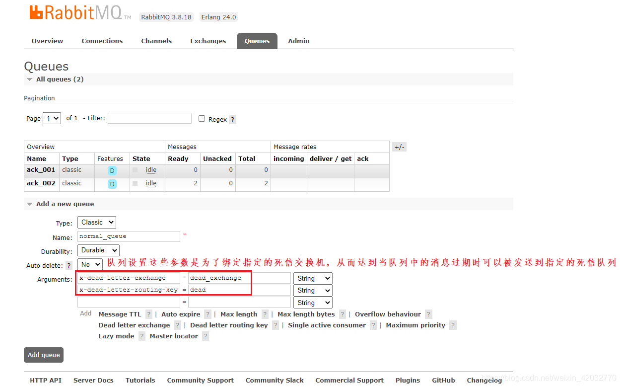 * 2.队列里面的消息是否持久化 默认消息存储在内存中(true表示持久化,数据是存在磁盘中的。false表示非持久化,数据是存在内存中的)
