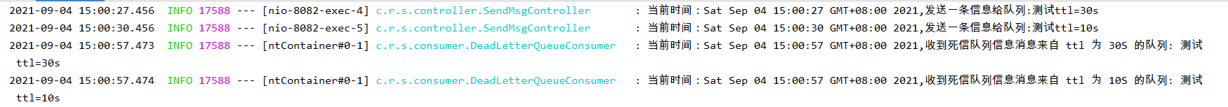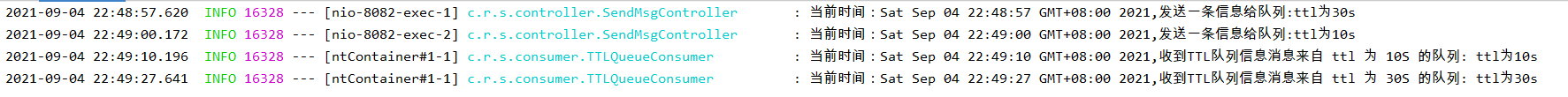 测试一下,先后发送ttl为30s和ttl为10s的两条消息。