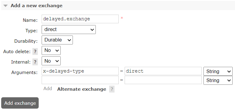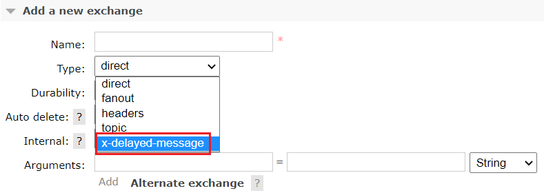安装完成后,重启rabbitMQ,打开客户端,在新建交换机的Type选项栏会新出现“x-delayed-message”。
