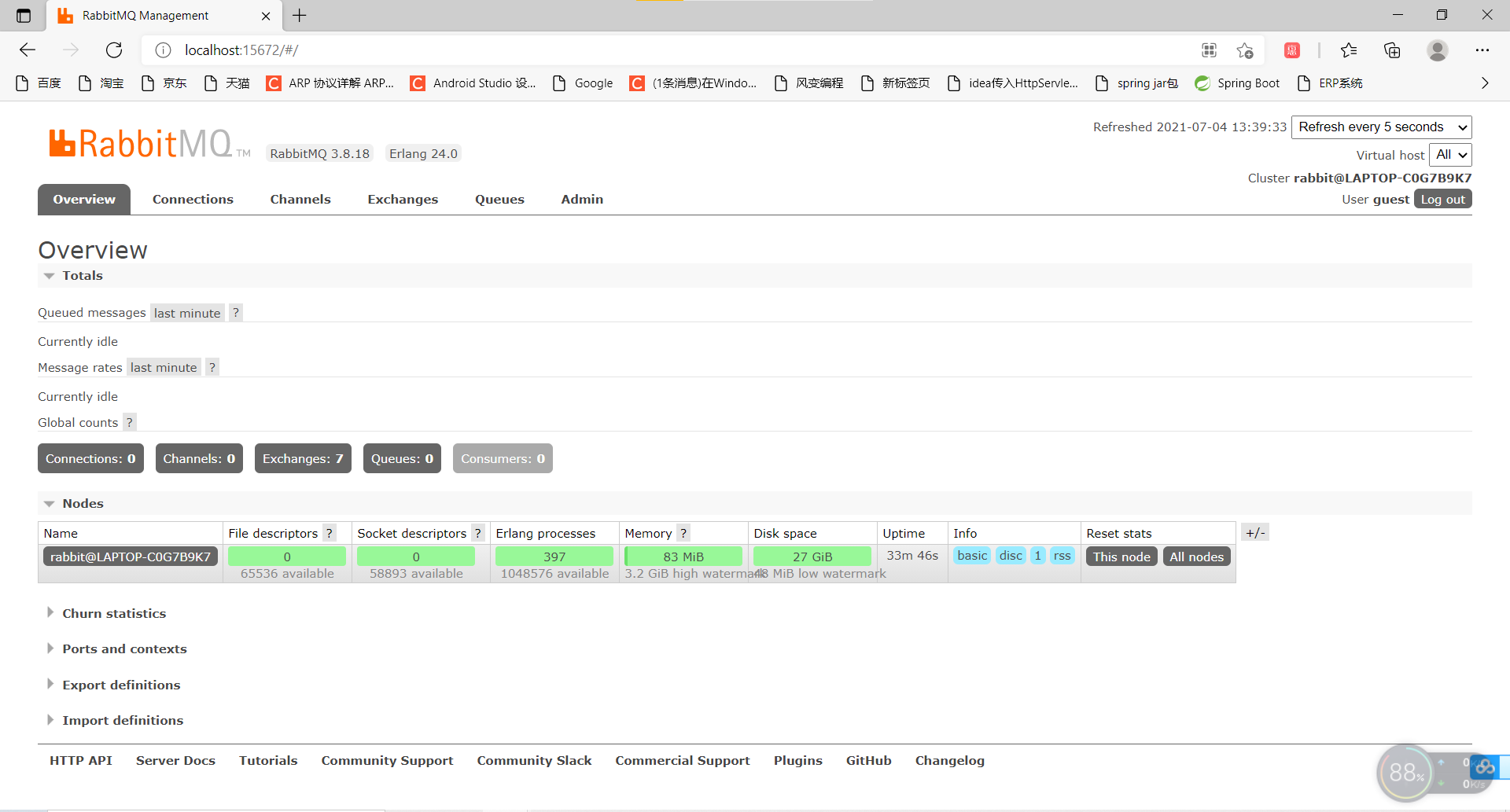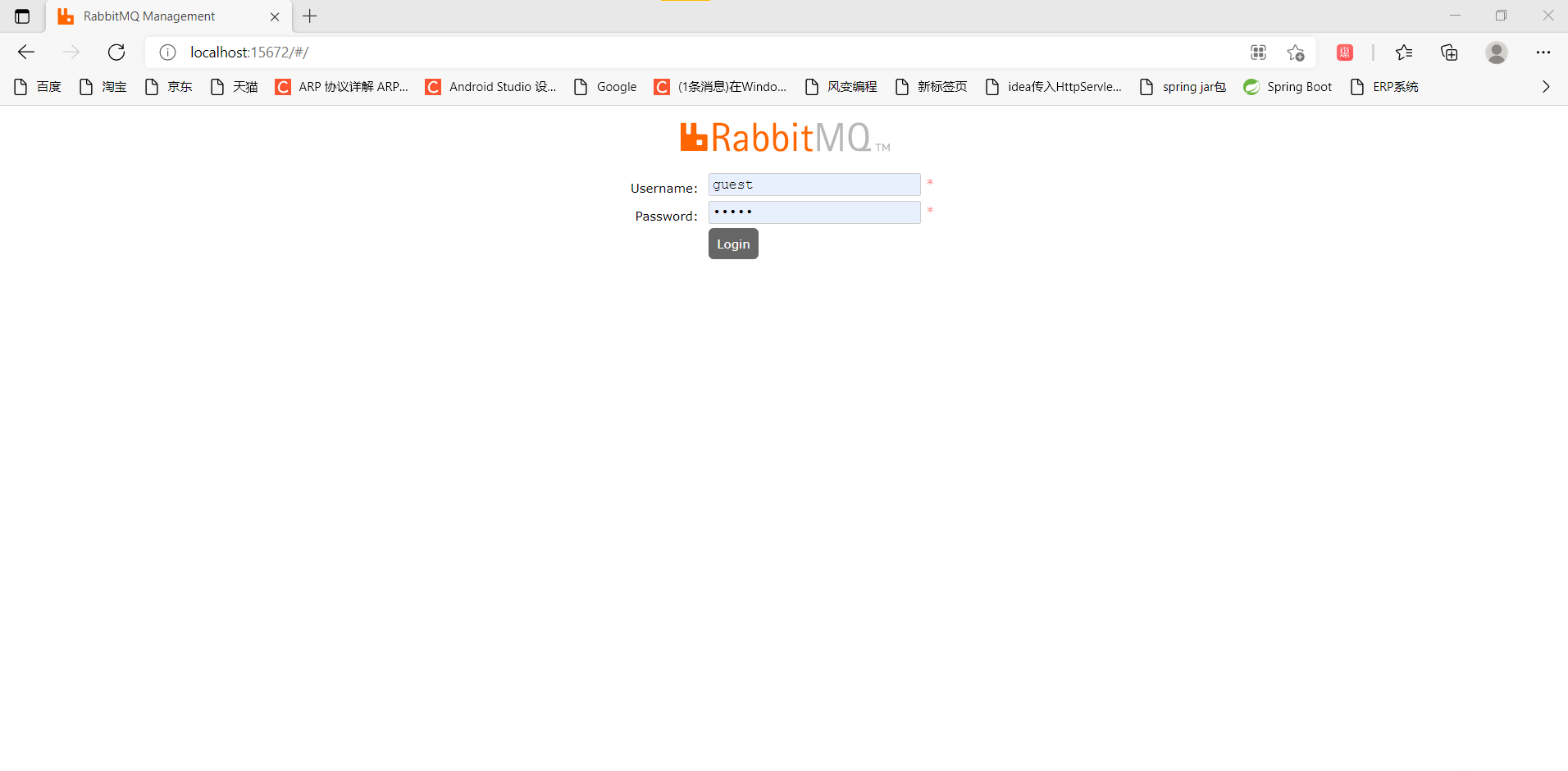 等启动完成后,就可以访问:RabbitMQ Management(http://localhost:15672/#/)初始用户名密码都是guest。