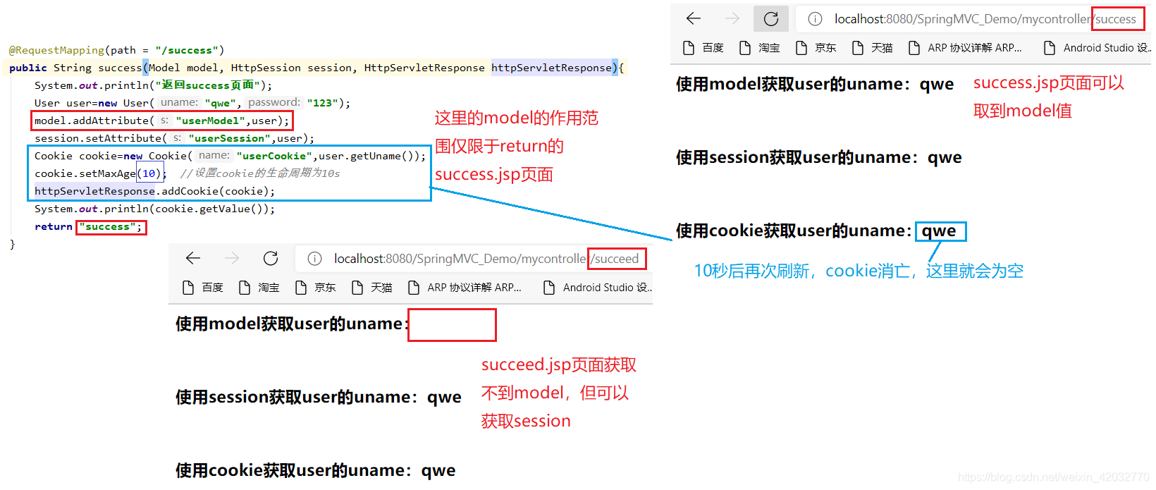 model是request级别的,model和session一样都是服务器缓存,只是不同于session,model的数据,只能在接下来的页面使用,其他页面就不能使用。因为model只是一个请求,model的作用域只是可以作用于请求model的那个页面,其他页面无法使用。