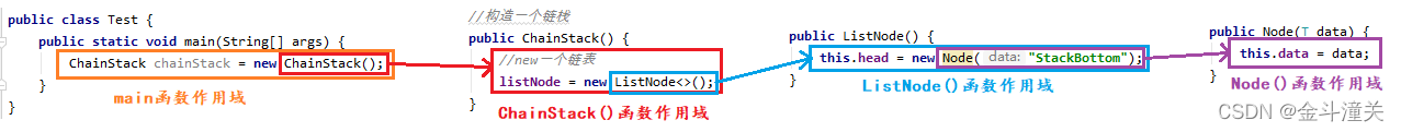 注:链表栈的数据结构中用到的Node和ListNode相关代码请参考:数据结构与算法之美——单链表复习_金斗潼关的博客-CSDN博客