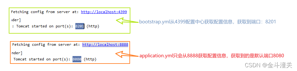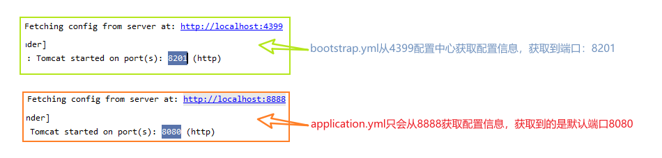 如果仅仅在application.yml中去绑定config server,application.yml会默认从8888获取配置信息,那么所获得的端口是默认的8080,无法从config server中获取任何配置信息。