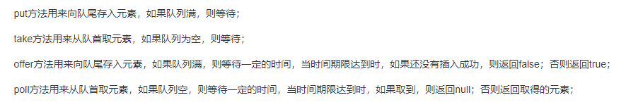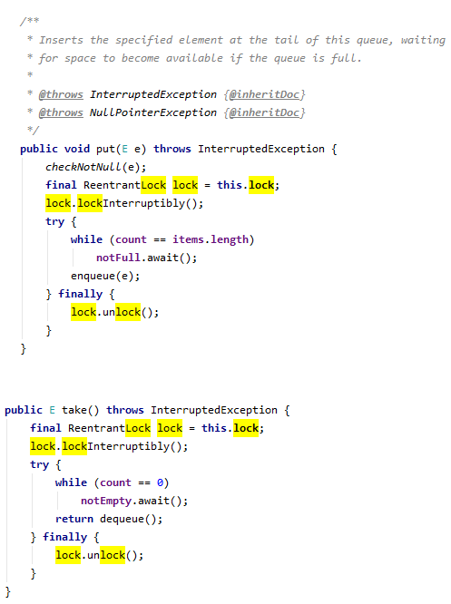 如上图所示:ArrayBlockingQueue类里面新增了put和take方法。put就相当于带锁的enqueue,take就相当于带锁的dequeue。