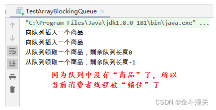 System.out.println("从队列领取一个商品,剩余队列长度" + (arrayBlockingQueue.size() - 1));