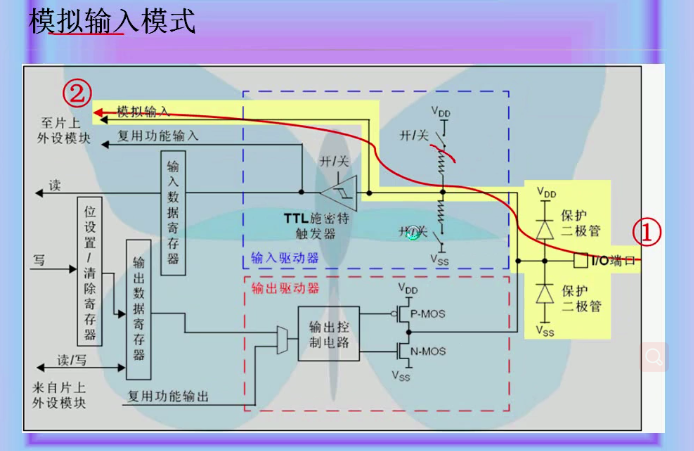 推挽模式:若输出控制为高电平,则P-MOS导通,N-MOS截止,I/O端口输出高电平。若输出控制为低电平,则P-MOS截止,N-MOS导通,I/O端口输出低电平。