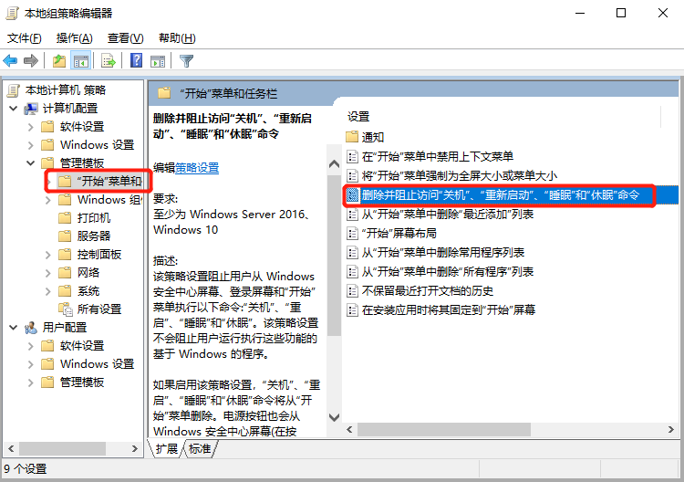 然后在组策略编辑器中定位“计算机配置”路径下的“管理模板”中的“开始菜单和任务栏”,找到“删除并阻止访问关机、重新启动、睡眠和休眠命令”的项目