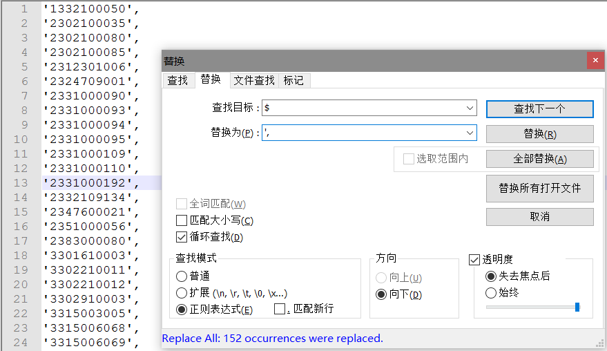 问题:给到EXCEL一列数据A1,要求在数据库表中将所有A字段 in A1的数据查找出来,这时想到将该列数据粘贴到notepad,行首加“'”,行尾加“',”