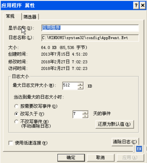 在事件查看器中右键应用程序(或安全性、系统、DNS服务器)查看属性可以得到日志存放文件的路径,并可修改日志文件的大小,清除日志。例如选中“应用程序”右键属性。