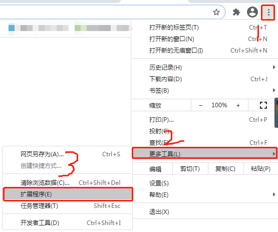 1.首先用户点击谷歌浏览器右上角的自定义及控制按钮,在下拉框中选择更多工具选项,然后点击扩展程序来启动Chrome浏览器的扩展管理器页面。