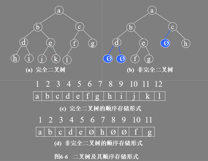 (1)顺序存储:用一组地址连续的存储单元依次“自上而下、自左至右”存储完全二叉树的数据元素(缺点:内存浪费)