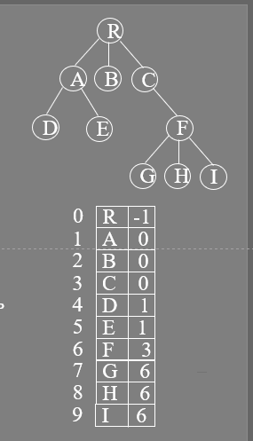1 typedef struct 2 { PTNode Nodes[MAX_SIZE] ; 3 int root; /* 根结点位置 */ 4 int num ; /* 结点数 */ 5 }Ptree ; 6