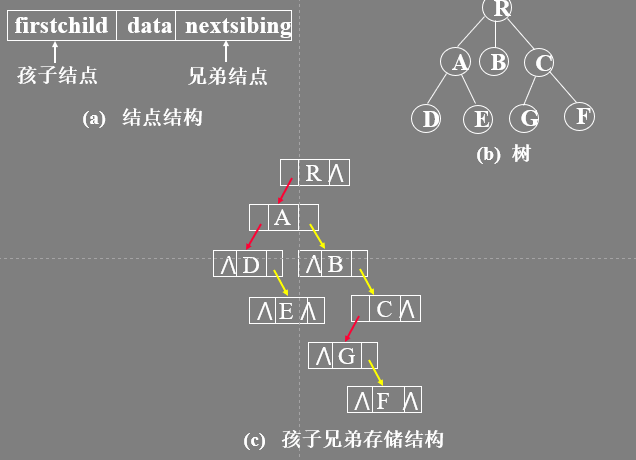 1 typedef struct CSNode /*孩子兄弟表示法的类型定义*/ 2 { 3 DataType data; 4 struct CSNode*firstchild,*nextsibling;//指向第一个孩子和下一个兄弟 5 }CSNode,*CSTree;