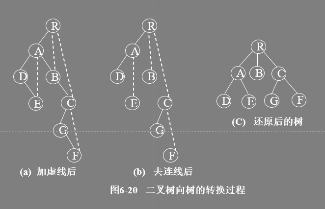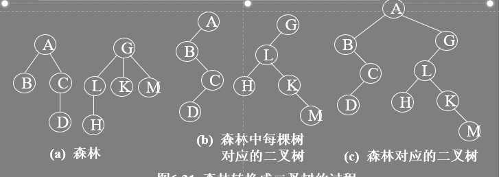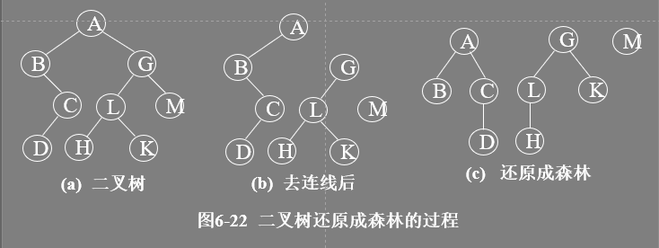 1.去连线。将二叉树B的根结点与其右子结点以及沿右子结点链方向的所有右子结点的连线全部去掉,得到若干棵孤立的二叉树,每一棵就是原来森林F中的树依次对应的二叉树。