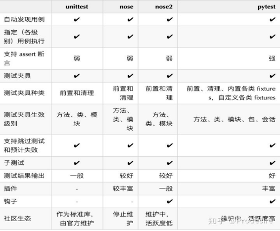 - pytest:基于unittest开发,简单的assert语句实现丰富的断言,无需复杂的self.assert*函数,自动识别测试模块和测试函数,兼容unittest和nose测试集,丰富的插件,易用性较好。
