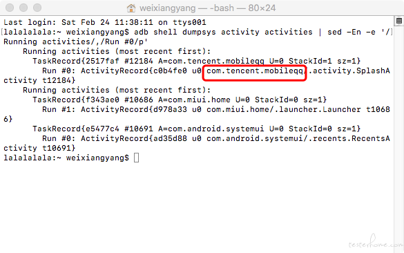 adb shell dumpsys activity activities | sed -En -e '/Running activities/,/Run #0/p'(例如:我清理手机后台之后,开启了QQ,输入命令之后,就会出现QQ的进程,框的地方就是qq的包名)