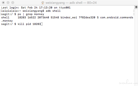 ps | grep monkey,返回来的第一个数字,即是monkey的进程号 - 然后kill pid 进程号。如图