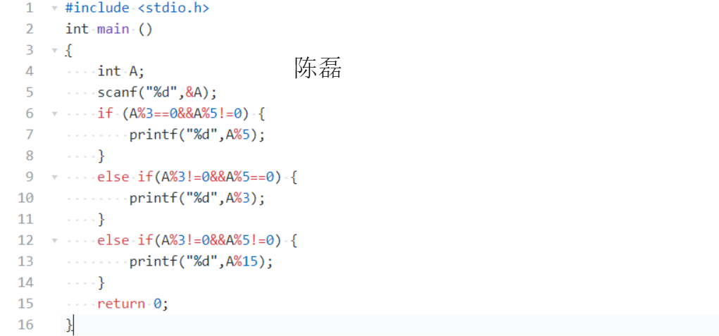 键盘输入1个正的整数A,如果A是3的倍数但不是5的倍数,则输出A除以5的余数。如果A是5的倍数但是不是3的倍数,则输出A除以3的余数。如果A既不是5的倍数但也不是3的倍数,输出A除以15的余数