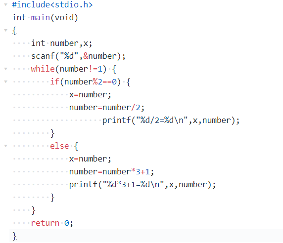 日本数学家古角静夫研究自然数时,发现一个有趣现象:“如果是个偶数就除2,如果是奇数就乘以3加1”,经过有限个这样的处理步骤,最后一定能得到1. 任意输入一个自然数,给出得到结果1的运算过程。