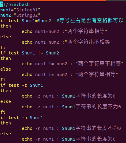 num1=100 num2=100 if test $[num1] -eq $[num2] then echo '两个数相等!' else echo '两个数不相等!' fi 输出结果: 两个数相等!