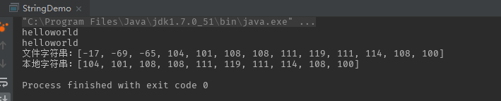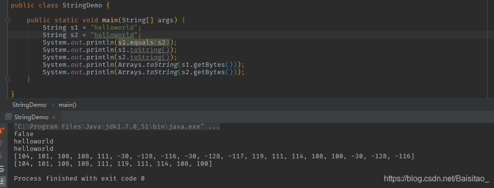 public static void main(String[] args) { String s1 = "helloworld"; String s2 = "helloworld"; System.out.println(s1.equals(s2)); System.out.println(Arrays.toString(s1.getBytes())); System.out.println(Arrays.toString(s2.getBytes())); }