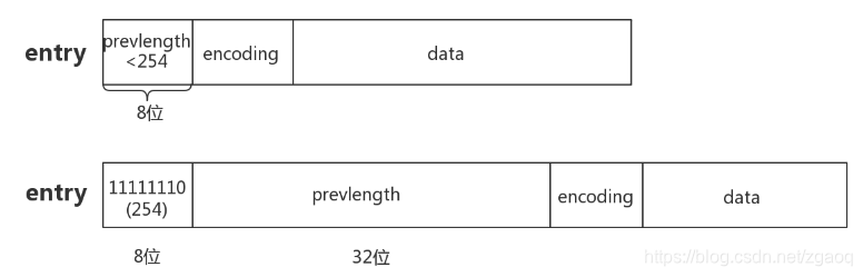 - entry的前8位等于254,则意味着上一个节点的长度无法用8位表示,后面32位才是真实的prevlength。用254 不用255(11111111)作为分界是因为255是zlend的值,它用于判断ziplist是否到达尾部。