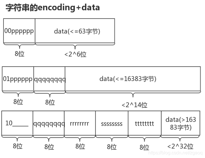 #define ZIP_STR_06B (0 << 6)//字符串data,最多有2^6字节(encoding后半部分的length有6位,length决定data有多少字节) #define ZIP_STR_14B (1 << 6)//字符串data,最多有2^14字节 #define ZIP_STR_32B (2 << 6)//字符串data,最多有2^32字节