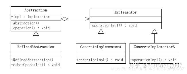 - 具体实现化(ConcreteImplementor)角色:这个角色给出实现化角色接口的具体实现。