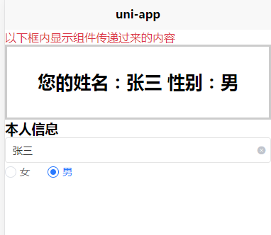 <template> <view> <h3>本人信息</h3> <uni-easyinput v-model="name" placeholder="您的姓名" inputBorder> </uni-easyinput> <uni-data-checkbox v-model="sex" :localdata="sexConfig"> </uni-data-checkbox> <Teleport :to="target"> <p>{{info}}</p> </Teleport> </view> </template> <script setup> import { ref, computed } from 'vue' defineProps({ target: { type: String, require: false } }) const name = ref('') const sex = ref('') const sexConfig = [{ "value": '女', "text": "女" }, { "value": '男', "text": "男" }] const info = computed(() => { let result = '' if (name.value) result += '您的姓名:' + name.value + ' ' if (sex.value) result += '性别:' + sex.value + ' ' return result }) </script>