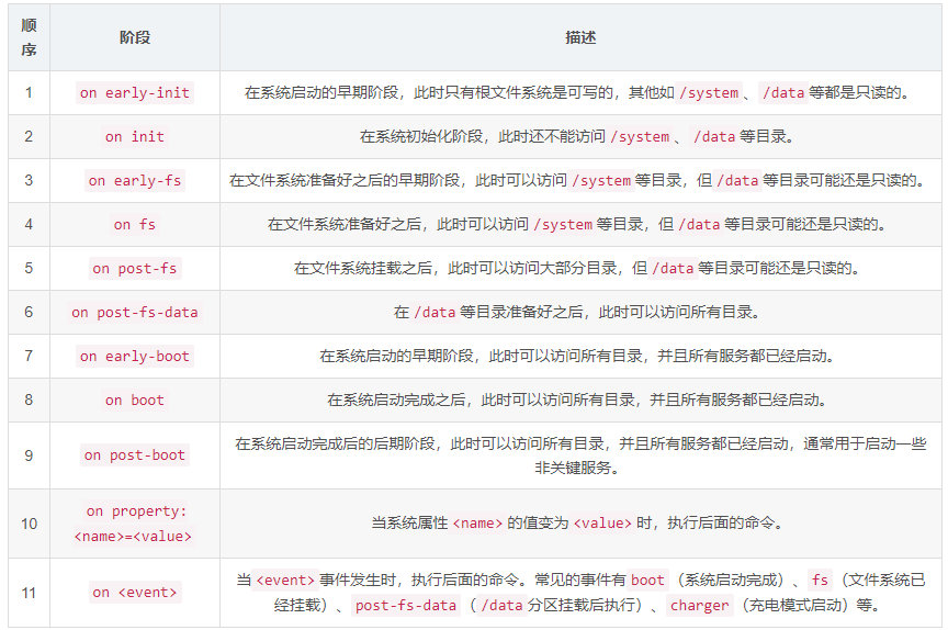 4.服务的启动时间顺序,可以init.rc里面阶段来选择: