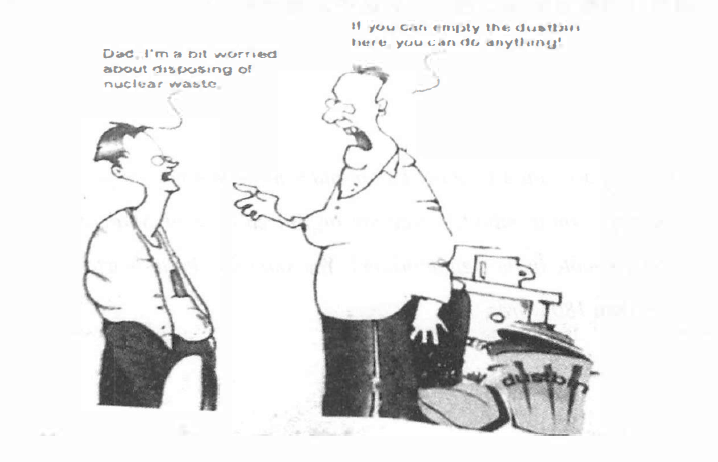 This drawing, apparently, can be naturally associated with the critical significance of doing small things. In the picture, a youngster expresses his worries about disposing of nuclear waste. To his shock, his father points at the dustbin, telling him, "If you can empty the dustbin here, you can do anything!"