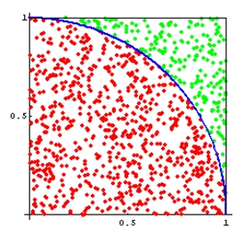 在这个正方形内部,随机产生n个点(这些点服从均匀分布),计算它们与中心点的距离是否大于圆的半径,以此判断是否落在圆的内部。