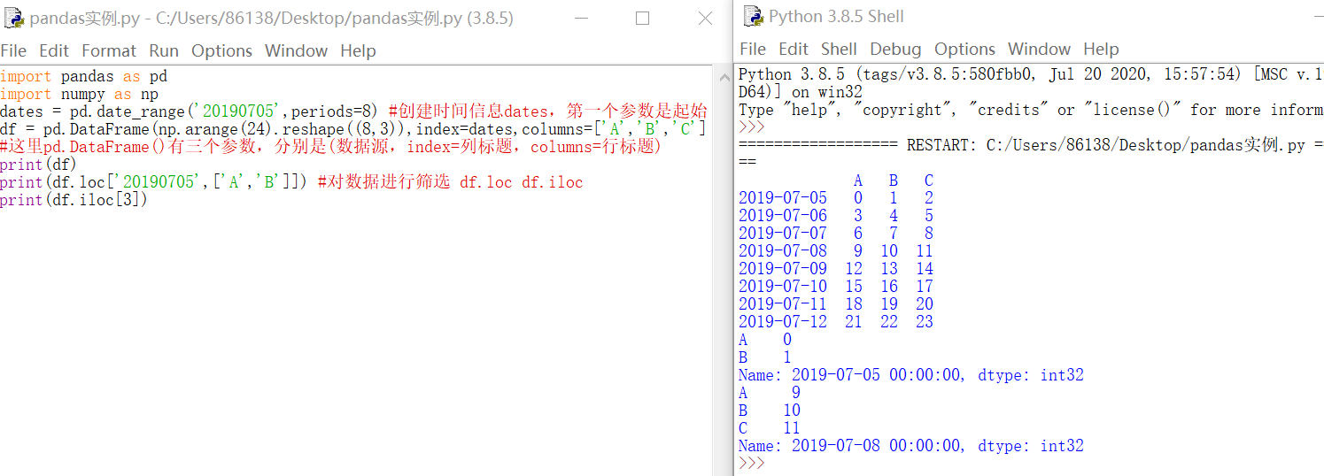 import pandas as pd import numpy as np dates = pd.date_range('20190705',periods=8) #创建时间信息dates,第一个参数是起始日期 periods是数量 df = pd.DataFrame(np.arange(24).reshape((8,3)),index=dates,columns=['A','B','C']) #这里pd.DataFrame()有三个参数,分别是(数据源,index=列标题,columns=行标题) print(df) print(df.loc['20190705',['A','B']]) #对数据进行筛选 df.loc df.iloc print(df.iloc[3])
