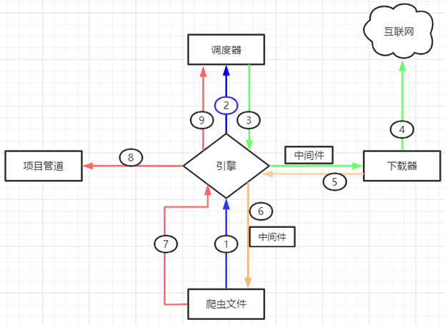 Scrapy框架主要由五大组件组成,它们分别是调度器(Scheduler)、下载器(Downloader)、爬虫(Spider)和实体管道(Item Pipeline)、Scrapy引擎(Scrapy Engine)。下面我们分别介绍各个组件的作用。